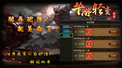 1.所有的装备全靠打,强力的神装轻松获得,野怪也能掉落装备,只要花费时间即可到达终极。