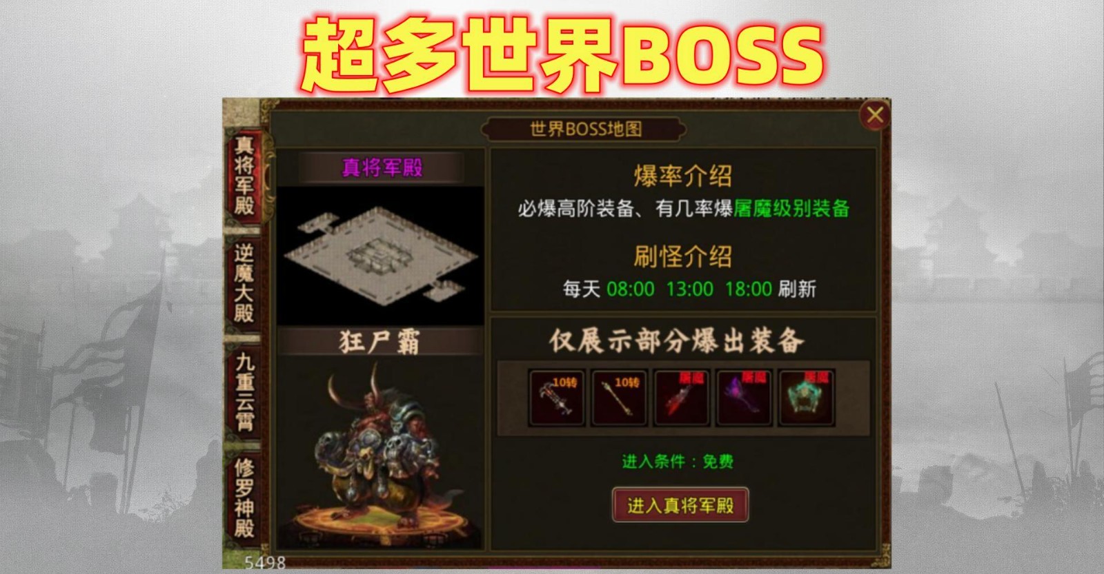 2.每天都有打不完的BOSS。免费VIP系统,炫酷神翼系统,超帅灵宠系统。