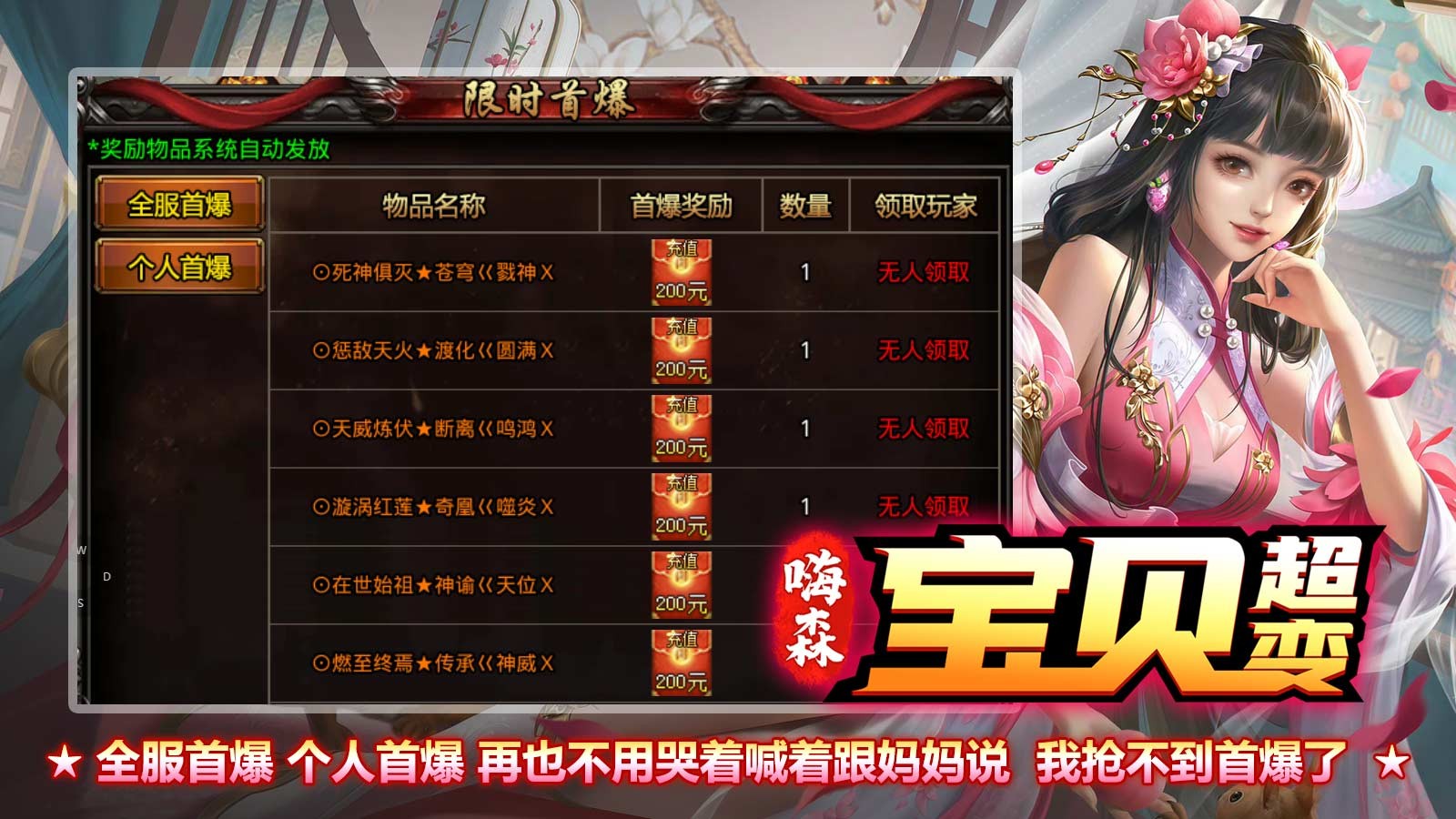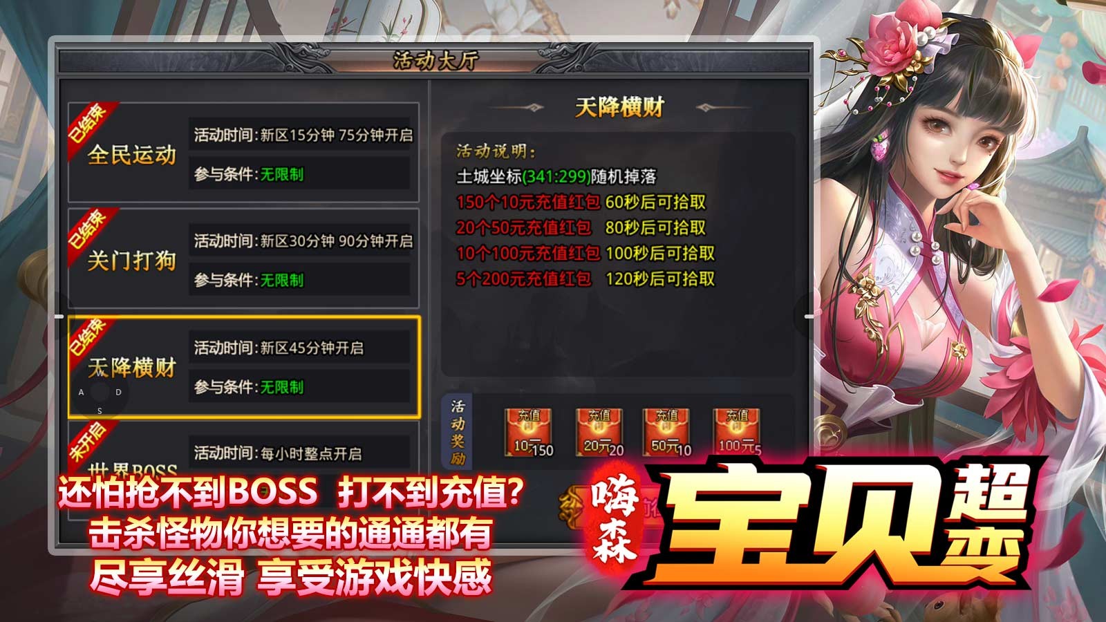 嗨森宝贝超超变为玩家带来精彩爽快的超变无限刀玩法,开局即可获得满攻速,尽情地享受刀刀暴击的爽快体验,所有的野怪和boss即时刷新,体验遍地光柱的震撼感受,小怪也能够掉落神装,只要花费时间即可获得终极,助你到达战斗力的巅峰,称霸整个传奇世界,畅享热血的对决挑战。