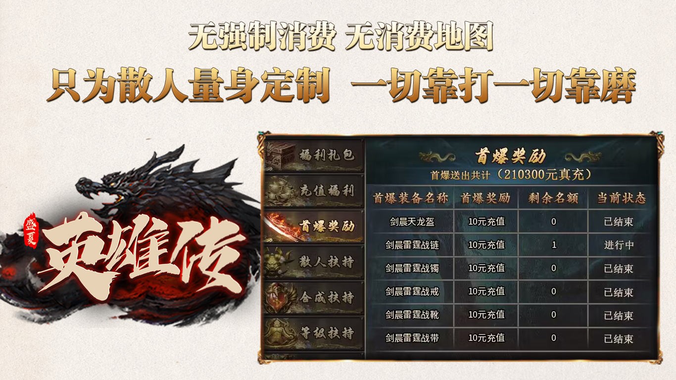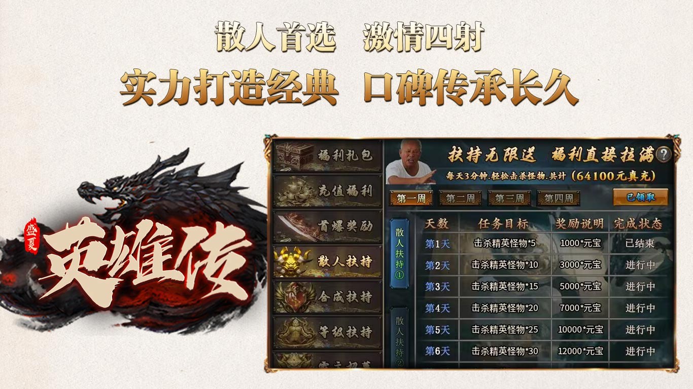 盛夏英雄传为玩家带来爽快复古传奇玩法,上线就送大量奖励,多重成就任务,更多丰富的福利等待着你的获取,轻松获得大量的神装奖励,快速提升自己的战斗实力,助你到达战斗力的巅峰,挑战排行榜的强者,书写你的传奇征途。