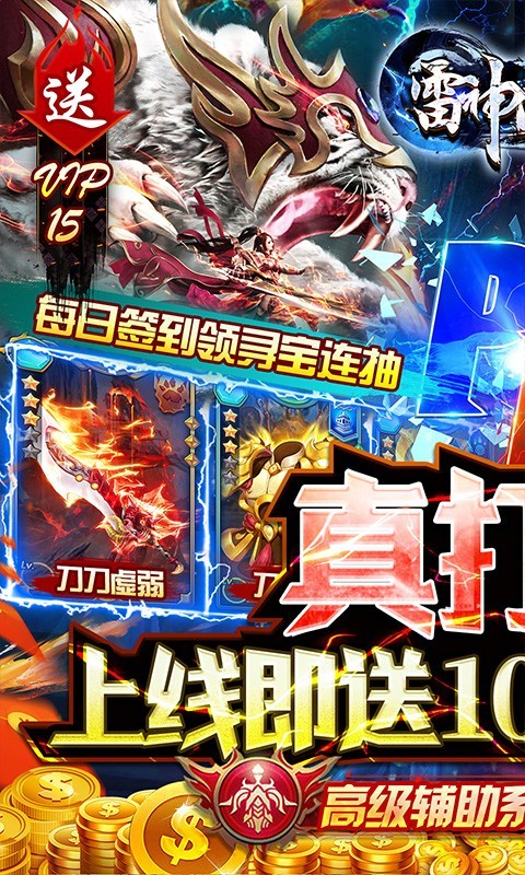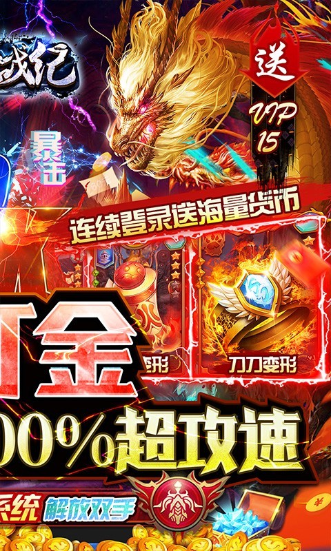 1.充值比例:1:1000(元宝),内置高级挂机辅助,100%超攻速畅快打金。