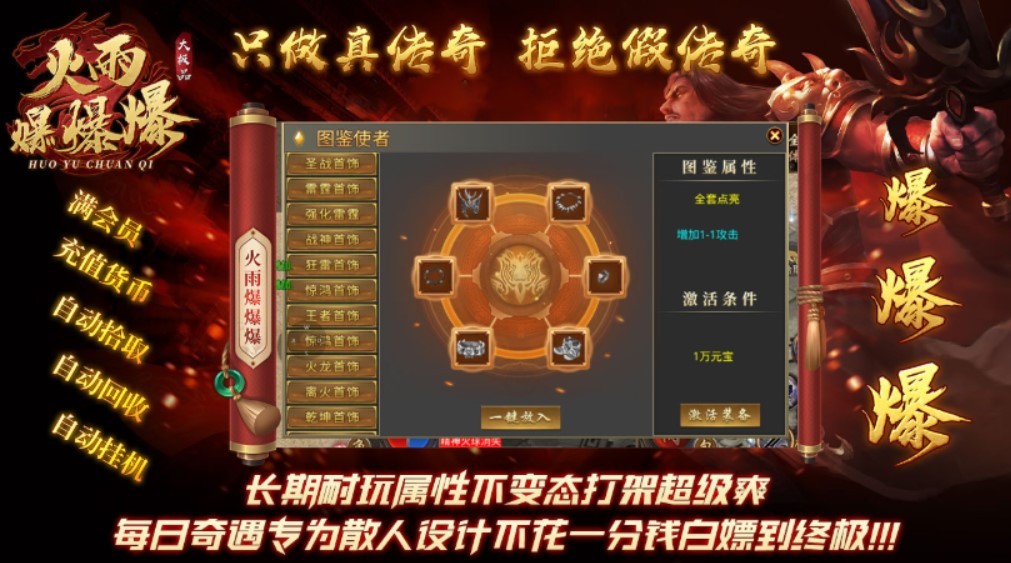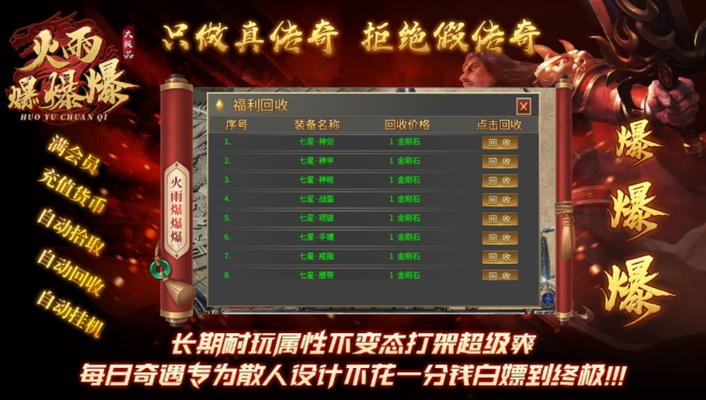 火雨爆爆爆大极品传奇来袭,刺激极品传奇竞技游戏,多元刺激的竞技游戏感受,微变鞋类传奇竞技游戏,传奇礼包奖励:5000元宝*1,一转证明*1,书页*20,时装碎片*10。进入游戏完成对应的新手任务,多样传奇元素结合,首爆高阶资源神器,回收大量资源,非常保值,非常值得广大玩家去尝试的传奇竞技冒险游戏。