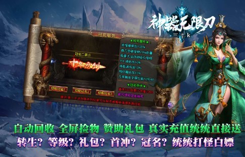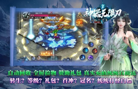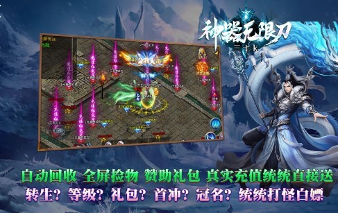 三七k神器无限刀传奇来袭,无限刀竞技类型传奇,上线获取盒子礼包,多样货币元宝奖励,各项融合资源和专属技能,传奇礼包奖励:绑定元宝*500000,绑定金刚石*500000,等级提升石*50,爆率全开,多套资源,实物资源轻松掉落,轻松打怪竞技,完成任务触发福利,激活各色资源奖励,非常值得去尝试的传奇竞技冒险游戏。
