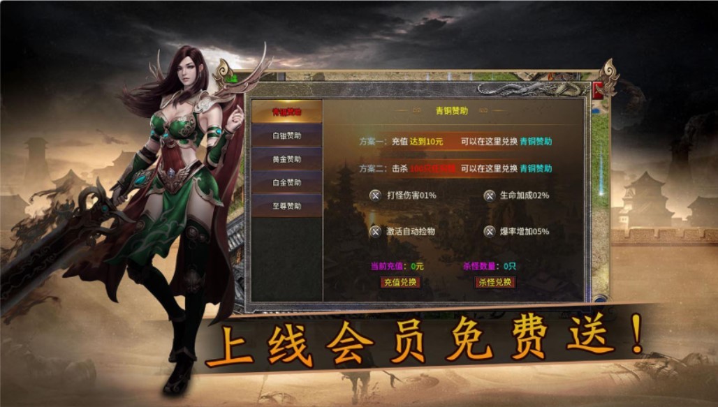 4、线就送VIP10、钻石18888、元宝88888、绑金*888888,开启指定装备回收,回收可得充值卡!