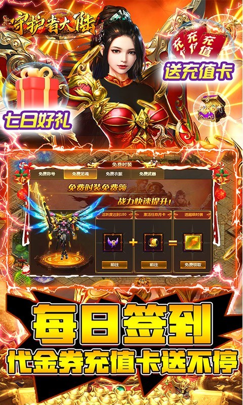 守护者大陆高爆版来袭,真实传奇,原汁原味的传奇竞技体验,轻松跨服竞技,不断冲击登记,激情屠龙传奇竞技相应,各色稀有传奇时装先到先得,无限传奇资源轻松爆,首冲返利非常丰富,每日签到轻松获取大量的资源奖励列表,0可敬也有非常多样的奖励资源,非常值得去尝试的传奇竞技冒险游戏。