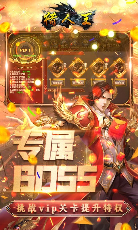 3.打boss掘金,,获取大量充值货币。10红包等你来领!vip免费送,挑战守将提升vip经验。