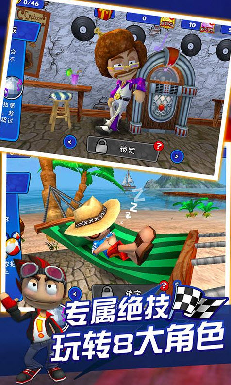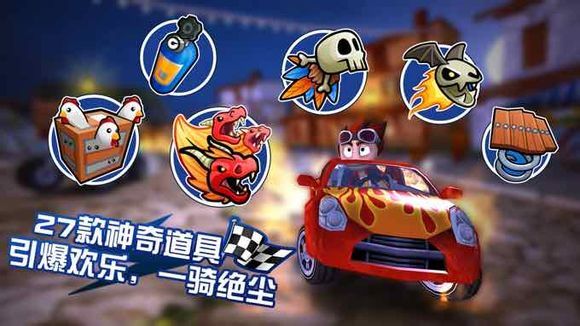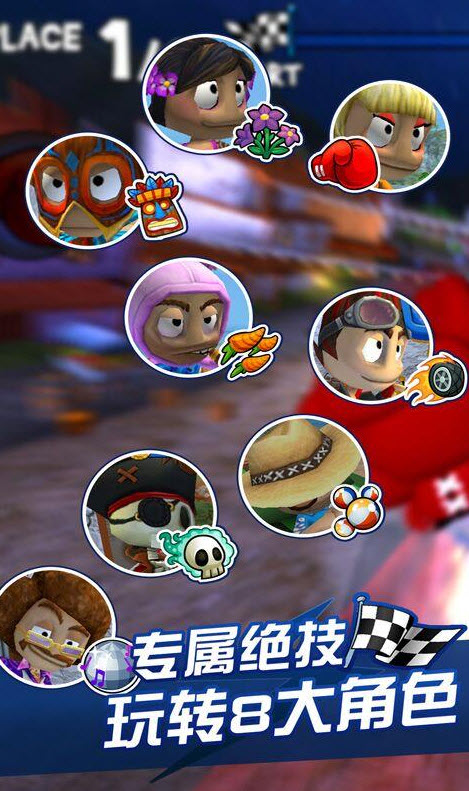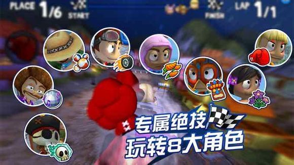 抢下对手的位置,施展独特个性和特殊能力,在梦幻般的赛道上,使用各种给对手致命一击的道具。