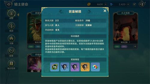 装备秘境的开启是需要玩家们的等级达到20级的,作为多人挑战副本,玩家们每天可以通关两次。秘境当中需要玩家们利用自己的实力来获取秘境的通关,完成之后可以获取大量的装备和升级道具材料等。