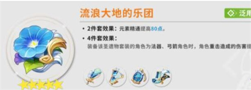 推荐大家搭配的第一套圣遗物是“乐团”的4件套。这个套装相对容易获得,大多数人都能拥有。基本上每个人都打过周本或者世界BOSS,或者进行过转化,手头上基本都有“流浪大地”的乐团套装。这个套装的效果相当不错,能够将角色的重击伤害提升35%。只需搭配两件套装,角色的元素精通就可以大幅度增强,性价比相当高。