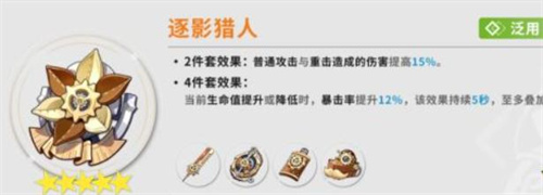第二套推荐的是“猎人”的4件套。这个套装的优势在于,它能够直接提高角色的普通攻击15%。重击伤害会提高15%。在装备上之后,如果角色掉血,技能造成暴击的概率还能够提高,最高可以提升36%的暴击率。这个数值相当夸张,所以非常实用。
