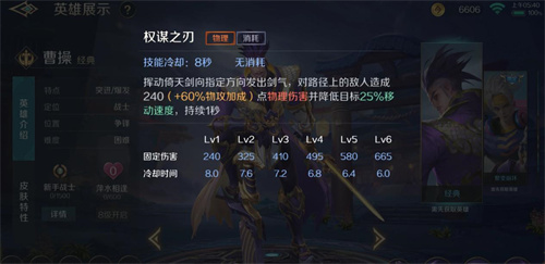 曹操的一技能“权谋之刃”是一个主要的伤害技能,开启后他可以向规定的地方划出一束剑芒袭击对手,形成物理的损伤并使敌人缓速。在PK中,曹操需要多次使用这个技能,以累积伤害并迅速使敌人减血。