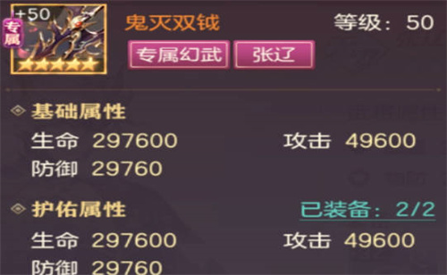 此外,张辽还拥有一件专属幻武器,名为“鬼灭双钺”。当这把幻武器达到满级时,它将为张辽提供约六十万的生命值和约十万的攻击力,同时还具备相当不错的防御属性。与张辽的专属技能相结合,这把幻武器能够在使用怒气攻击后获得15%的增伤效果,可以说是一件攻守兼备的神器。