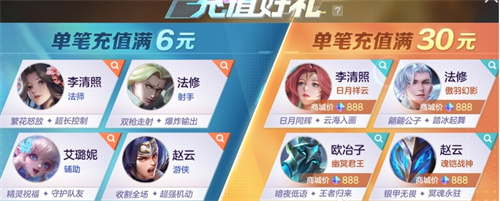 一旦进入游戏,玩家们将会被引导到主页面,详细信息位于屏幕的左下角,精心设计的【充值好礼】活动将会显露。在这个活动中,玩家们有机会通过充值套餐来迅速解锁各种英雄角色。充值套餐包括两个选项,其中之一是热门英雄套餐,其中包含了四个备受追捧的英雄角色。对于那些渴望获取英雄角色的玩家而言,只需支付6元即可获得心仪的英雄。而这些英雄角色无疑是游戏中实力较为强大的存在。
