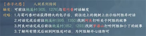 先要和大家介绍的是阿良这个人的背景故事和他的有关信息。阿良是位于桃溪村的一个朴素善良的采药男孩,虽然他自己非常不爱讲话,但乐观善良的心依然温暖的其他的身边人。而他也就在桃溪村的码头位置处等待着大家的前来到访,大家可以前往此处,领取赤子之心的任务。
