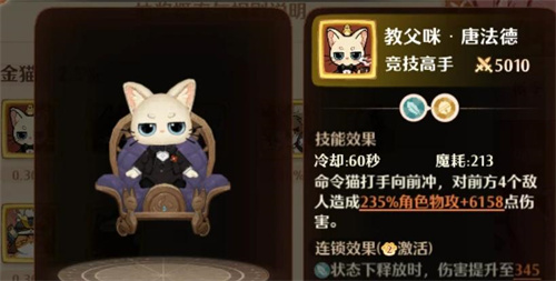 金猫与红猫相比,虽然战斗力强度较低,但是却有个显著的优点,那就是他们可以相对容易地被玩家获取。教父咪·唐法德则在游戏的竞技场环节中显得尤为出色。他身上的技能组合与策略布局,使他成为了众多玩家在竞技场中争夺胜利的重要工具。