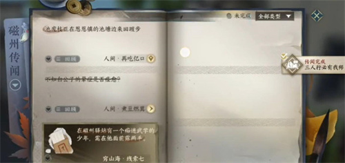 拥有了《论语》,玩家便可以继续自己的探险,完成人间任务·三人行必有我师。前往磁州找马项禹,把《论语》交给他,再去三个地方和那三个人对话,最后回马项禹处完成任务。这个任务有多个选择,每个选择都将会有不同的结果。作为奖励,玩家将获得剧情点、风云令、绑玉以及一件珍贵物品。