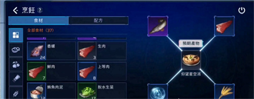 在《星球重启》中,玩家经常要出门。当在外面的时候,如果表示饱食的圆圈变成了红色,就必须立刻去吃东西。为了能在任何时间都能吃到东西,可以事先收集一些食材,然后把食材制作好放在背包中。有些食材不仅可以增加角色的饱腹度,还有一些其他的作用,而且制作起来也很容易。比如著名的美食【仰望星空】,只要把收集来的水,鱼,小麦等食材制作就可以了,使用后,玩家在未来10分钟内,伤害增加10%。