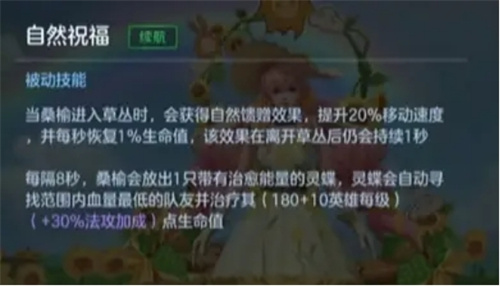 这个英雄有一个非常变态的恢复能力,他可以在草丛中移动,增加30%的移动速度,并且恢复40点的血量,这个恢复速度是以秒为单位的,如果玩家们知道了这个特点,在游戏初期,他们就可以选择【神恩】来增加自己的血量。