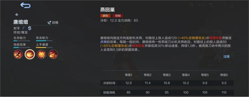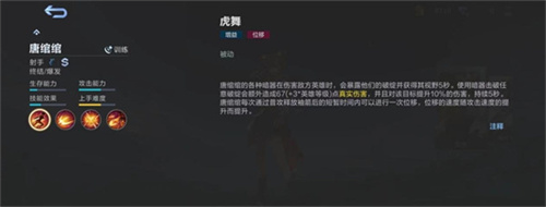 "虎舞"是唐绾绾的被动技能,最为独特。每次攻击都会暴露敌人弱点,提高伤害,并持续5秒。每次普通攻击都带有短暂移动,速度随攻击速度增加。这个被动技能使她成为高机动狙击手,难以被对手捉住。在战斗中,这技能能发挥巨大作用,因此高手常选用之。"燕回巢"是唐绾绾当前主要攻击技能。她朝特定方向发射机械燕子,命中目标后,触发"虎舞"技能,同时对目标造成伤害并减缓其移动速度。如果燕尾剑击中两次,敌人将被定身。这技能需要根据敌手位置巧妙运用,考验命中率。