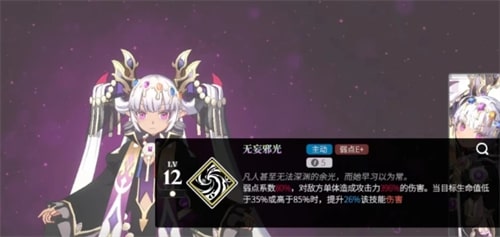 这是小闪的第一个技能,弱点系数是80%在游戏里面,如果玩家使用这个技能的话,能够给敌人造成第一次的高额伤害,虽然只是一个一技能,但是伤害值不低,而且如果玩家攻击的敌人的生命值已经低于35%了,还可以提升这个技能的伤害值,如果敌人的生命值高于85%同样也能触发这个被动,所以这个一技能感觉就很有趣,在伤害的时候还会有额外的加成。