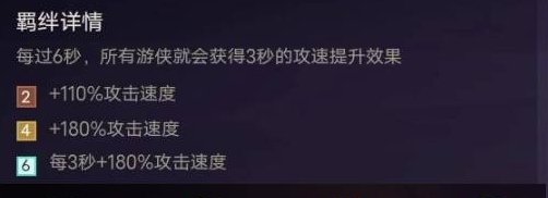 2.攻速型羁绊,每次增加攻速需要有6秒准备时间(6羁绊下3秒),增加攻速让游侠棋子输出更高,也变相增加回蓝,增加技能释放效率,另一方面攻速提升也更容易触发攻击特效,如天罚弩神被动技能的真伤。