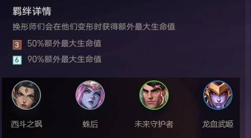 2.羁绊效果类似斗士羁绊斗士增加血量,但斗士羁绊是直接增加血量,而换型师是在棋子变形的时候增加额外百分比的最大生命值,而换型师中大部分棋子变形会增加血量,这让换型师触发羁绊效果后血量更高,变相增加坦度。