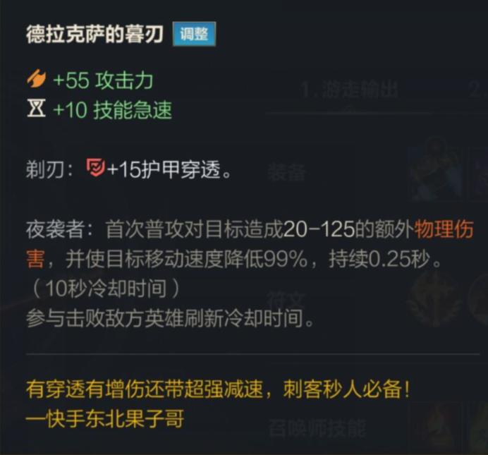 德克萨斯的暮刃:暮刃和幽梦一样,都是提供55攻击力和15点技能急速,并且还有15点护甲穿透,加上孙悟空Q技能自带的护甲削减,以及另一件核心装备-黑切的加成,即便是面对的敌方坦克英雄也可以打出非常不俗的伤害。至于后排嘛,再多看我一眼你就爆炸,直接一棍子敲洗~