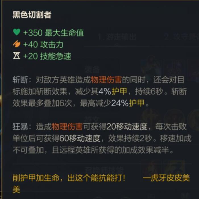 黑色切割者:提供40攻击力和20技能急速,还有350点最大生命值加成。被动是对目标造成伤害时削减敌方的护甲,以及造成物理伤害时可以提供额外移速。这三件装备选择完成后就是走极致的穿甲和输出装,在中后期敌方AD面对我们这一套出装时即使有闪现有位移,也会脆的和一张纸一样。