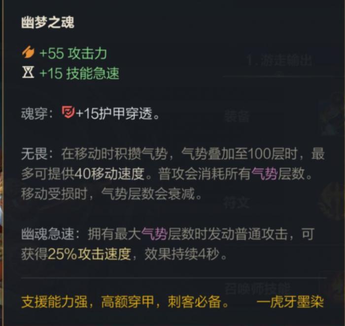 在出装上,个人推荐的核心三件装备为幽梦、黑切和暮刃,走极致的穿甲装和伤害装。