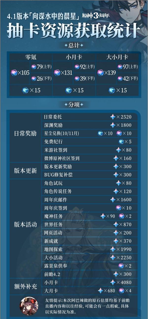 (1)本次原石预估汇总基于4.1前瞻直播内容和以往版本经验进行的预估计算,预计波动为±5抽左右,小伙伴们可以用作参考,具体以实际情况和个人游戏肝度为准!