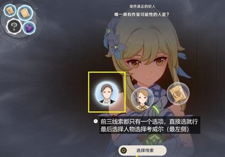 前三线索只有一个选项,直接选就行。最后选择人物时,选择考威尔(最左侧人物)