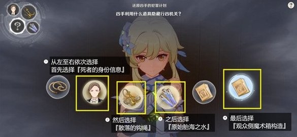 首先选择『死者的身份信息』(左起第二个),然后选择『散落的钩绳』(左起第三个),之后选择『原始胎海之水』(左起第四个),最后选择『观众侧魔术箱构造』(最右侧选项)。如下图。