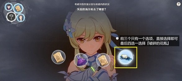 前三个只有一个选项,直接选择即可,最后四选一选择『破碎的花瓶』(右起第一个)。如下图。