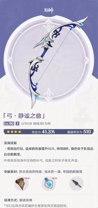 锻造弓箭,收到治疗后伤害提升,目前来看,老角色不太容易吃到加成,可能还是为枫丹新角色准备的。