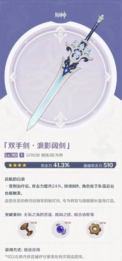 这把大月卡双手剑,造型是有点不符合小编审美的,不知道旅行者们是怎么看待它的颜值。他的属性模板有点像强化版本的以理服人。许多老角色都可以用,实在缺武器的可以买一把。