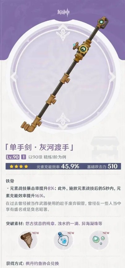 接下来我们看看钓鱼武器,这把全新钓鱼武器是单手剑,造型还是蛮奇特的。不过从副词条加元素充能来看,目前适合它的也主要是辅助角色,比如行秋。不过大部分人的行秋应该都有祭礼剑了,所以这把武器除非是想玩个新鲜造型,否则没有太多必要专门去换。