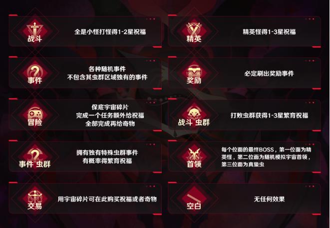 我们的行走的路线首先奖励区域,如果可能,也可以尝试复制奖励区域。在宇宙碎片富足的时候,可以将交易区域规划到接下来的路线里。非毁灭命途来说,精英区域的收益并不比战斗区域高太多,甚至精英区域只给一个祝福,而战斗区域能给两个甚至三个祝福。大部分事件都是有风险的,事件区域可选但一定不是最优选。冒险区域的话一般视作100宇宙碎片+一个祝福,收益高于常规战斗区域。