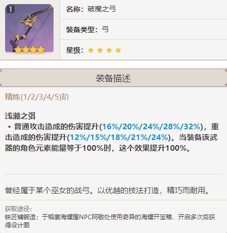而破魔之弓的输出手法会改变成先进行四次重击,再开启大招,最后用元素战技收尾的方式,区别于其他武器的先进行大招的释放,再进行四次重击,最后元素战技收尾的方式。
