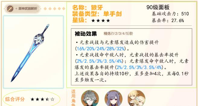 适配性较高的角色,首先想到的就是艾尔海森。艾尔海森主打EQ技能伤害和蔓激化,并且技能都具备多段攻击的特性。在此之前,艾尔海森的适配性武器里面,三星的黎明神剑反而成了五星武器之下的守门员,四星武器没有合适的。精1的狼牙就能接近精5黎明神剑,并且没有血量上的顾虑;精5的狼牙更是可以超过部分五星武器。故狼牙完全可以替代黎明神剑,作为新的守门员。
