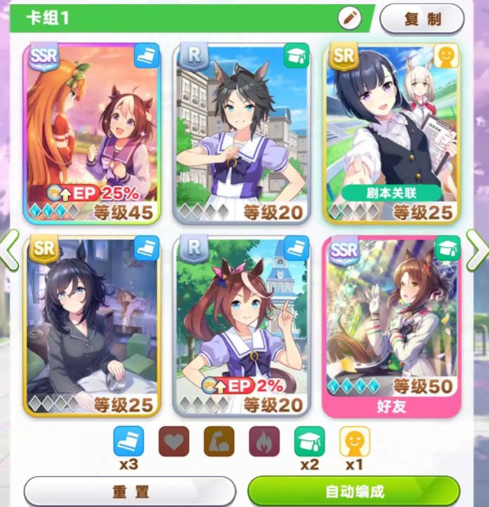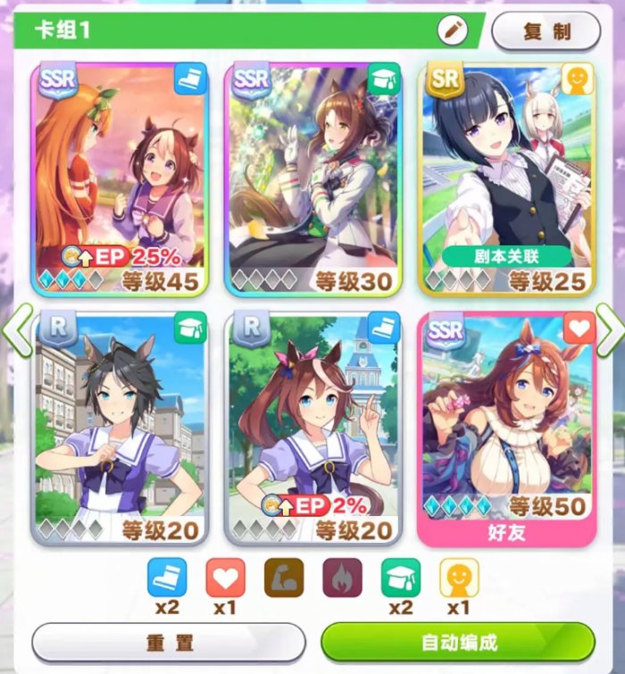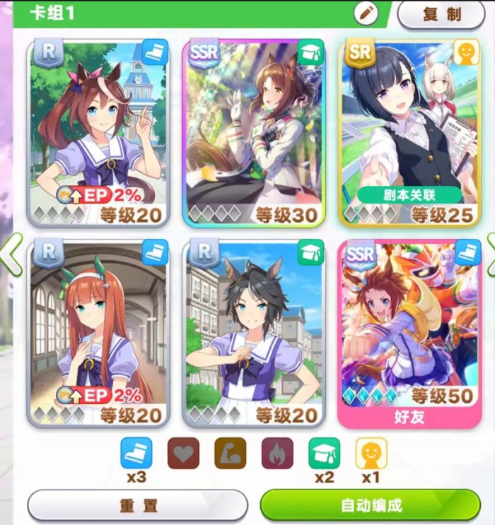 然后带着一堆R卡就开始无限刷种马的过程,这里一定要去借满破的SSR辅助速卡