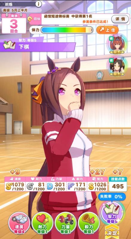 2.开局先约个会提升心情,训练主智副速(沙滩特训时全部满级训练,所以拉一下速度,主速副智)。平时保持体力在四分之三即可,用智力训练恢复体力,经量不用休息。