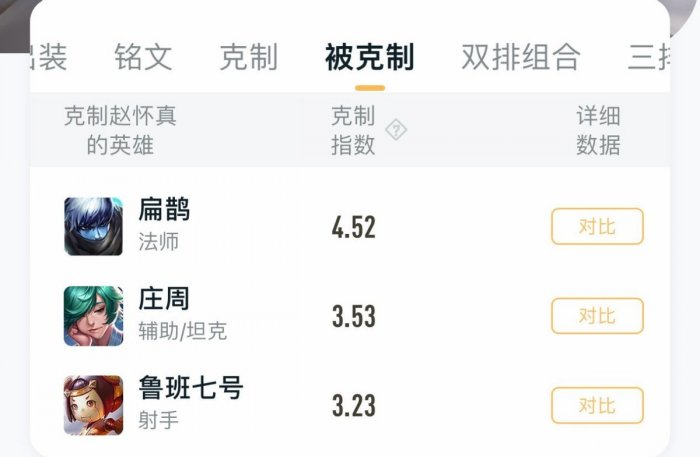 在营地的数据中,最克制赵怀真的是扁鹊,一个没有位移的法师为什么会位居榜首?因为赵怀真的控制能力其实比较弱,扁鹊被切是可以放出技能的,这样就可以凭借自身一定的坦度和强大的回复能力把血线拉回来,甚至赵怀真一套打上去没有人家回的多,不仅仅是保护自己,也可以保护射手。