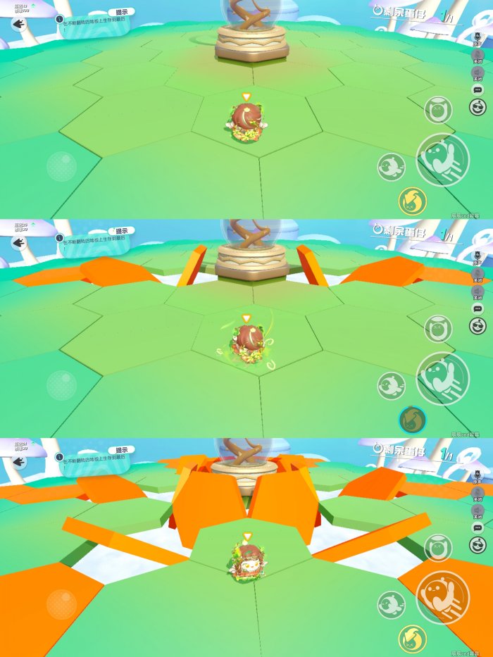 最后30s地板会从最外圈开始翻,直到翻到最内圈,没有一块地板能幸免。这时候一定要往最内圈靠,然后用跳扑从缝隙扑到外圈去,才能活下来。最后五秒钟又会来一次,而且这次翻得更快,对扑的要求更极限。