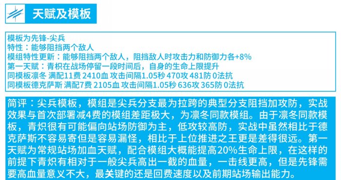 简评:尖兵模板,模组是尖兵分支最为拉跨的典型分支阻挡加攻防,实战效果与首次部署减4费的模组差距极大,为凛冬同款模组。由于凛冬同款模板,青炽很有可能偏向站场防御为主,低攻较高防,实战中虽然相比于德克萨斯不容易寄但是容易漏怪,相比于上位推进之王更是差得很远。第一天赋为常规站场加血天赋,配合模组大概能提高20%生命上限,在这样的前提下青炽有相对于一般尖兵高出一截的血量,一击线更高,但是先锋需要高血量意义不大,最关键的还是回费速度以及前期站场输出能力。