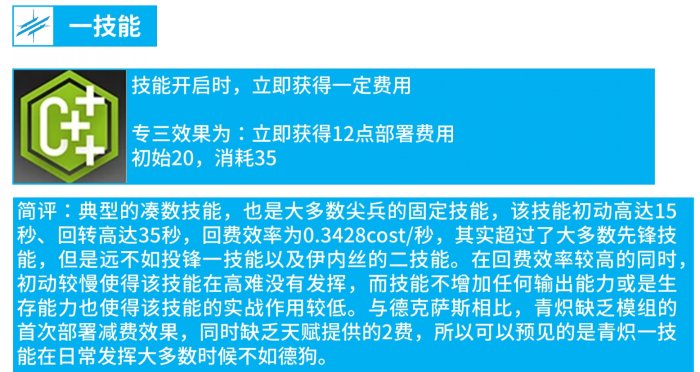 简评:典型的凑数技能,也是大多数尖兵的固定技能,该技能初动高达15秒、回转高达35秒,回费效率为0.3428cost/秒,其实超过了大多数先锋技能,但是远不如投锋一技能以及伊内丝的二技能。在回费效率较高的同时,初动较慢使得该技能在高难没有发挥,而技能不增加任何输出能力或是生存能力也使得该技能的实战作用较低。与德克萨斯相比,青炽缺乏模组的首次部署减费效果,同时缺乏天赋提供的2费,所以可以预见的是青炽一技能在日常发挥大多数时候不如德狗。
