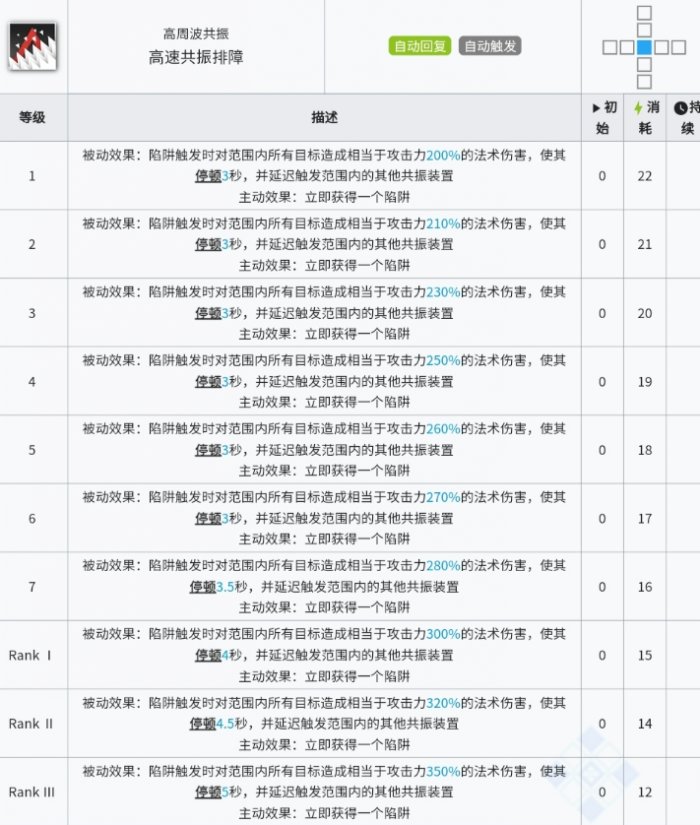 三技能提供大范围群攻以及停顿效果,由于是法术伤害不易刮痧,该技能瞬发伤害高达3859或7718(暴击),平均DPS高达1544,实战可以控制多个单位,所以实战发挥也很明显。延迟触发范围内其他装置有时候需要,不需要的时候可以撤退触发的装置以取消。