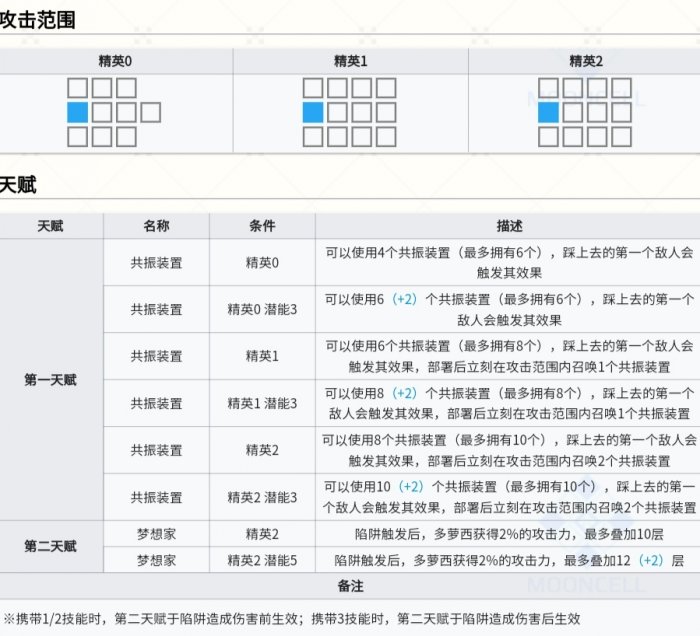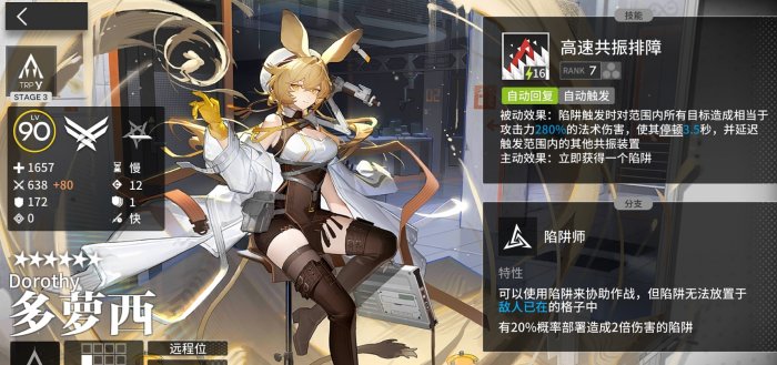 多萝西天生低费,但是算上陷阱的费用实际费用并不低。生命上限、攻击和防御都较低,不过攻击叠加上模组升级提供的最高40%攻击加成后可以说堪称全游最强速狙,有着明日方舟中最高的DPS(甚至是未叠攻击时),也是缪缪的流形指定复制单位之一。第一天赋落地时自带两个已部署陷阱,虽说对于一般玩家影响不大,不过少人中很关键,常常需要凹开局。第二天赋加攻天赋,实战作用明显,满潜配合模组提供高达48%攻击加成,原先的攻击白值有745,加成后高达1103。模组的话建议开一级或三级,一级使用足够,毕竟已经有超过20%的输出加成,模组升级作用也很明显,三级实战加成可以说非常明显。