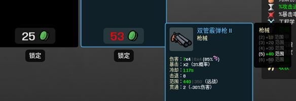 但是拾取并不一定就会自动合成强化,比如说我们身上只装备了1把武器,那么在购买第二把同品级武器的时候不会强化,而是直接装备上。如果我们身上已经没有武器空栏,再购买同品级武器就会自动合成。在武器栏页面就能够对武器进行手动的合成或者是回收(低价出售)。这里告诉大家一个小技巧,如果刷新出了想要的武器但是暂时没有足够的材料购买,就先将其锁定,等到下一回合再买!