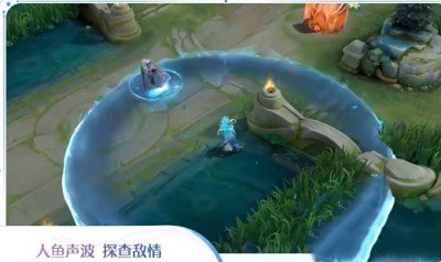 向前腾空跃起化为人鱼形态,若落点是地面,朵莉亚将创造一片水域,落地时为附近友方英雄回复250(+40%法术攻击)点生命,一旦离开水域超过3秒就会消失。