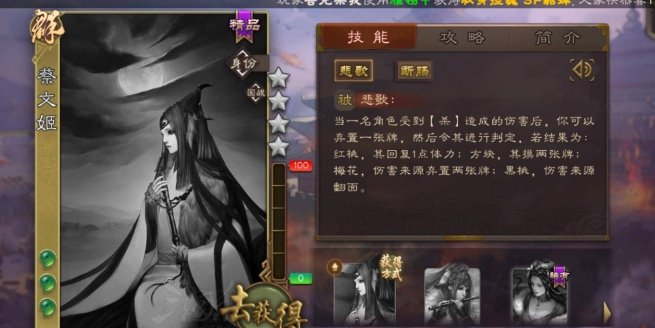 2、蔡文姬的第二个技能是悲歌,该技能是一个辅助技能,在其他角色被杀掉血之后,蔡文姬可以弃置一张牌进行判定,不同的判定花色可以触发不同的效果,总体来说是有益于掉血玩家。
